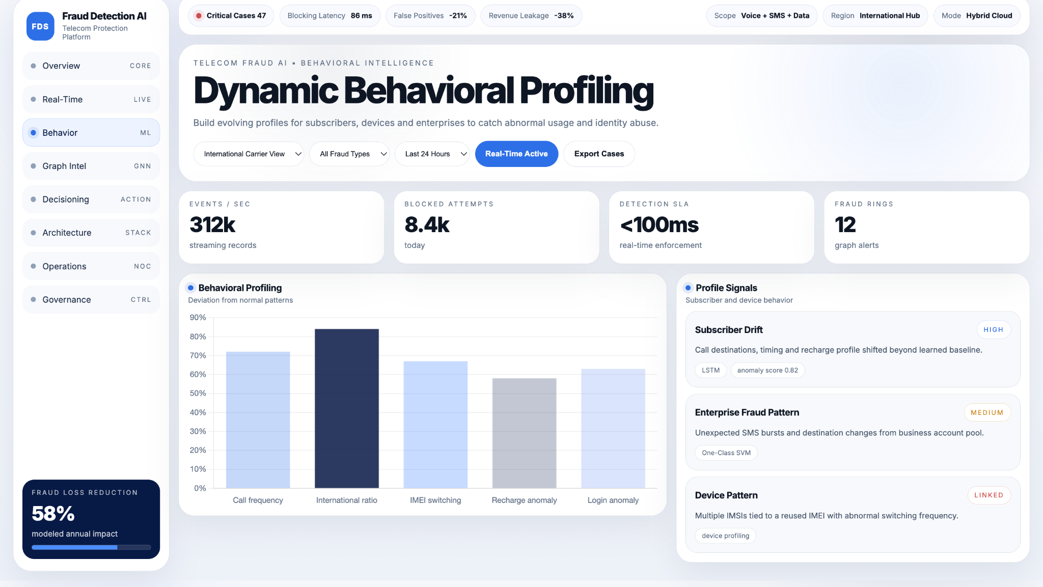 Beyond real-time detection, the platform builds dynamic behavioral profiles for subscribers, devices, and enterprise accounts. These profiles evolve continuously based on usage patterns, allowing the system to detect subtle deviations that indicate potential fraud.