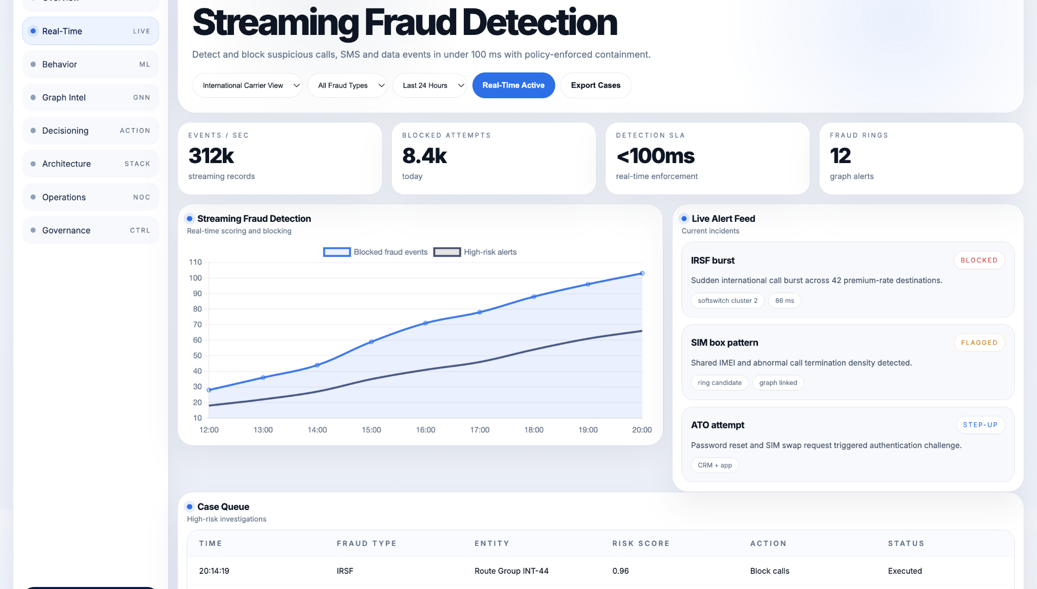 Through high-throughput stream processing and low-latency model inference, the platform performs real-time scoring and decisioning in under 100 milliseconds. This enables immediate blocking of fraudulent activity before it generates significant revenue loss.