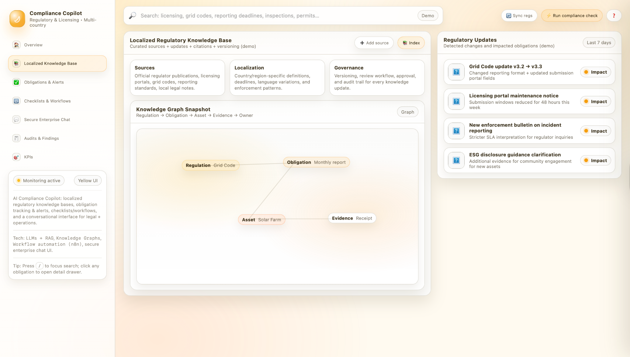 Managing compliance across borders requires more than just a document repository; it requires a dynamic understanding of local laws. The platform features a Localized Regulatory Knowledge Base that provides curated and version-controlled sources for country-specific grid codes, licensing standards, and local legal notes. The system maps the relationships between specific regulations, the resulting obligations, and the evidence required to prove compliance for each asset.