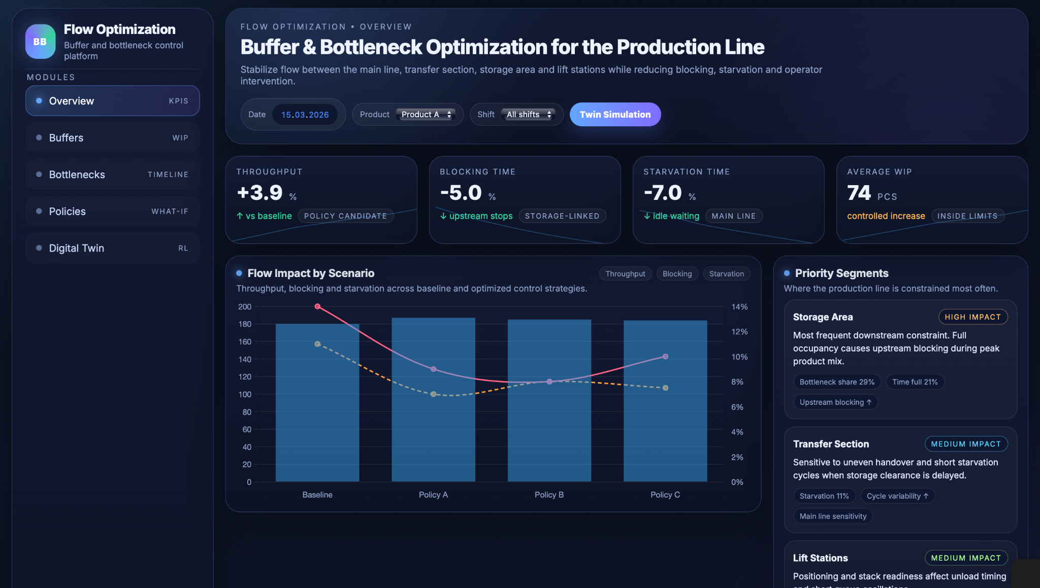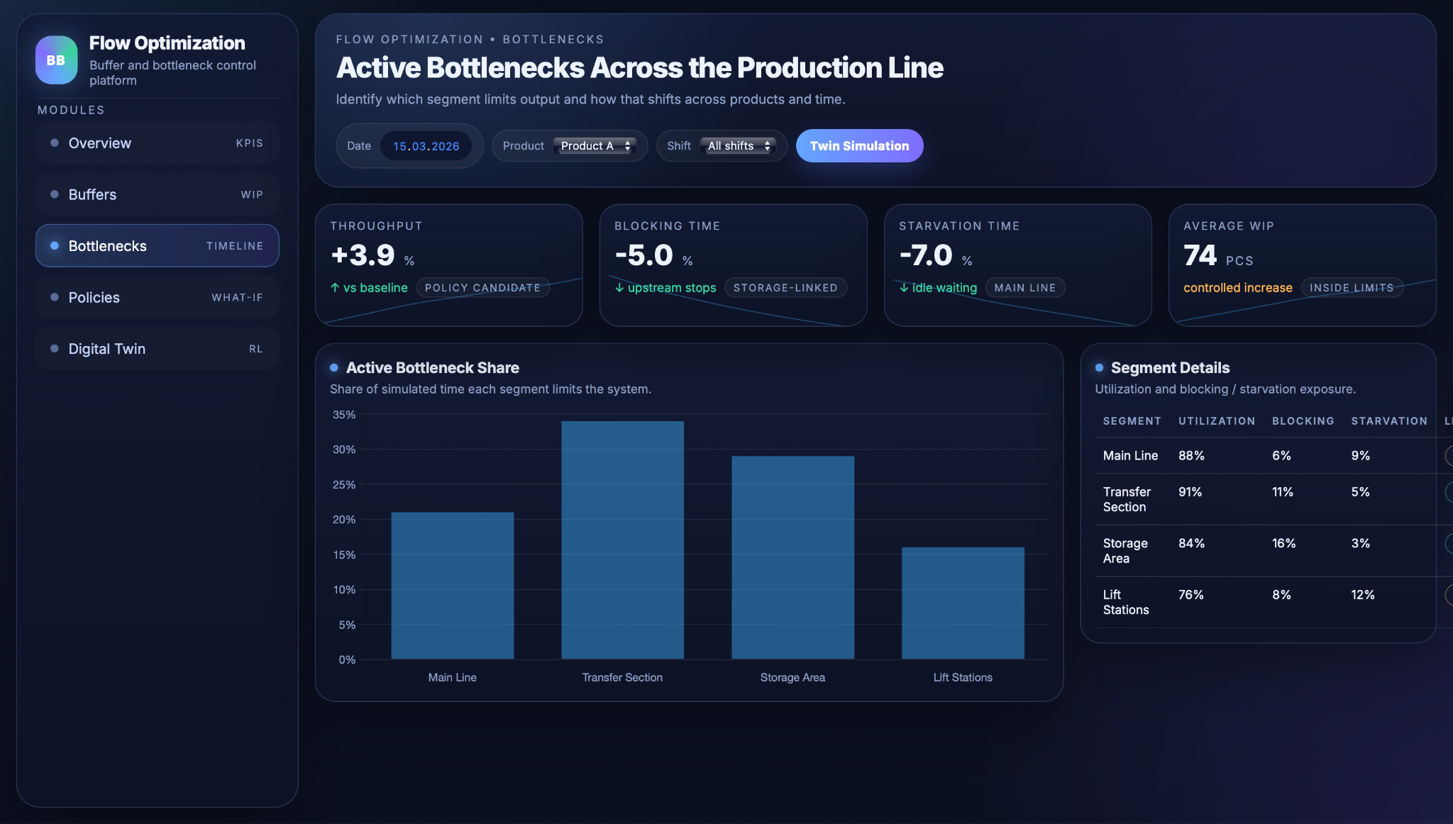 Dashboards present the results of the digital twin in a form that can be used in daily work. For each shift, they show throughput together with the share of time lost to blocking and starvation, so the team can quickly see whether flow stability is improving or getting worse. A bottleneck view highlights which part of the line limits production over time, helping engineers focus on the real constraint instead of relying on assumptions.