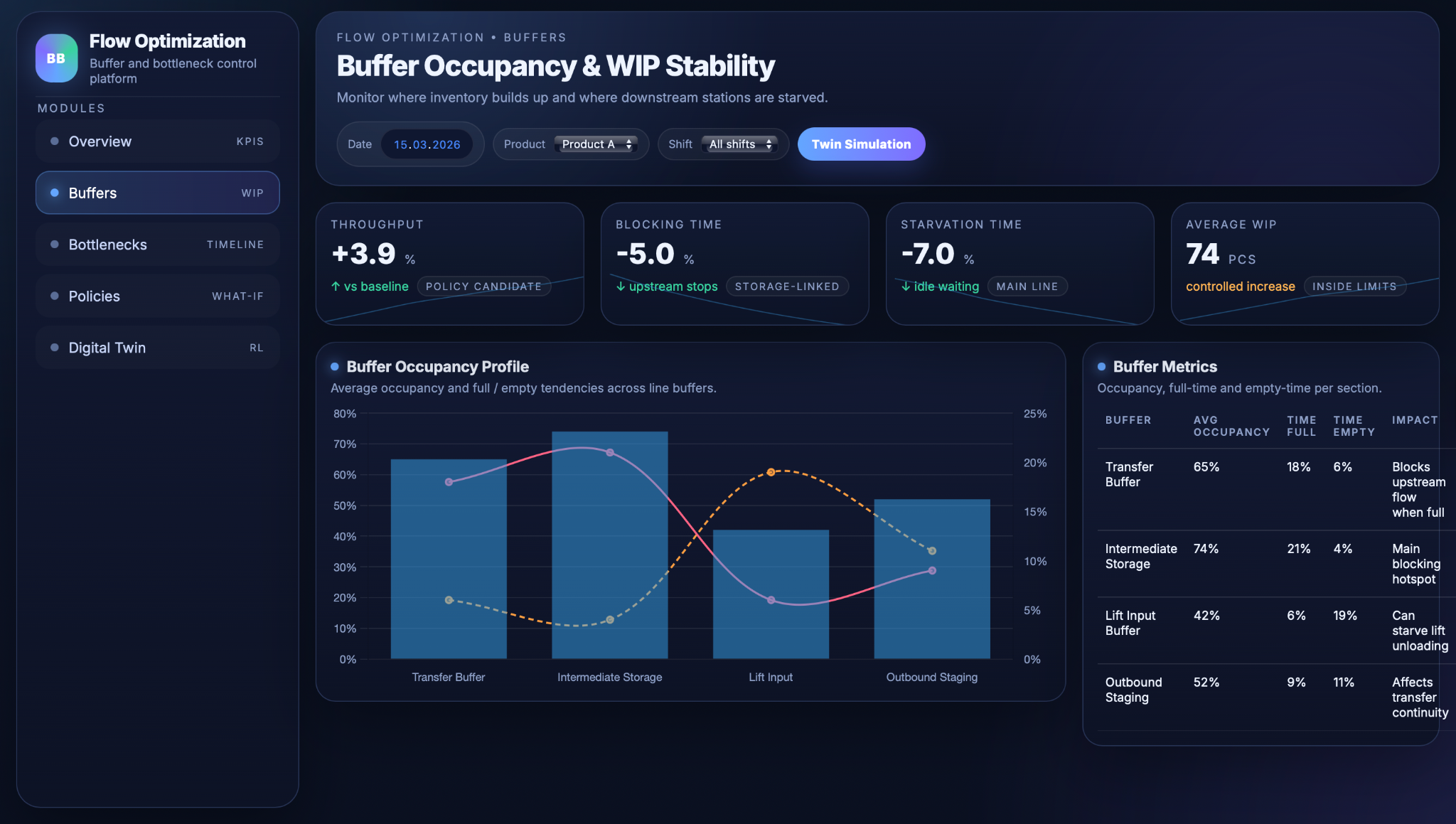 At the same time, buffer usage is tracked over time, including how often buffers are full or empty and how often these states cause the line to stop. These results show which buffers are too small, too large, or poorly controlled, and where small changes in capacity or control rules could improve flow stability the most.