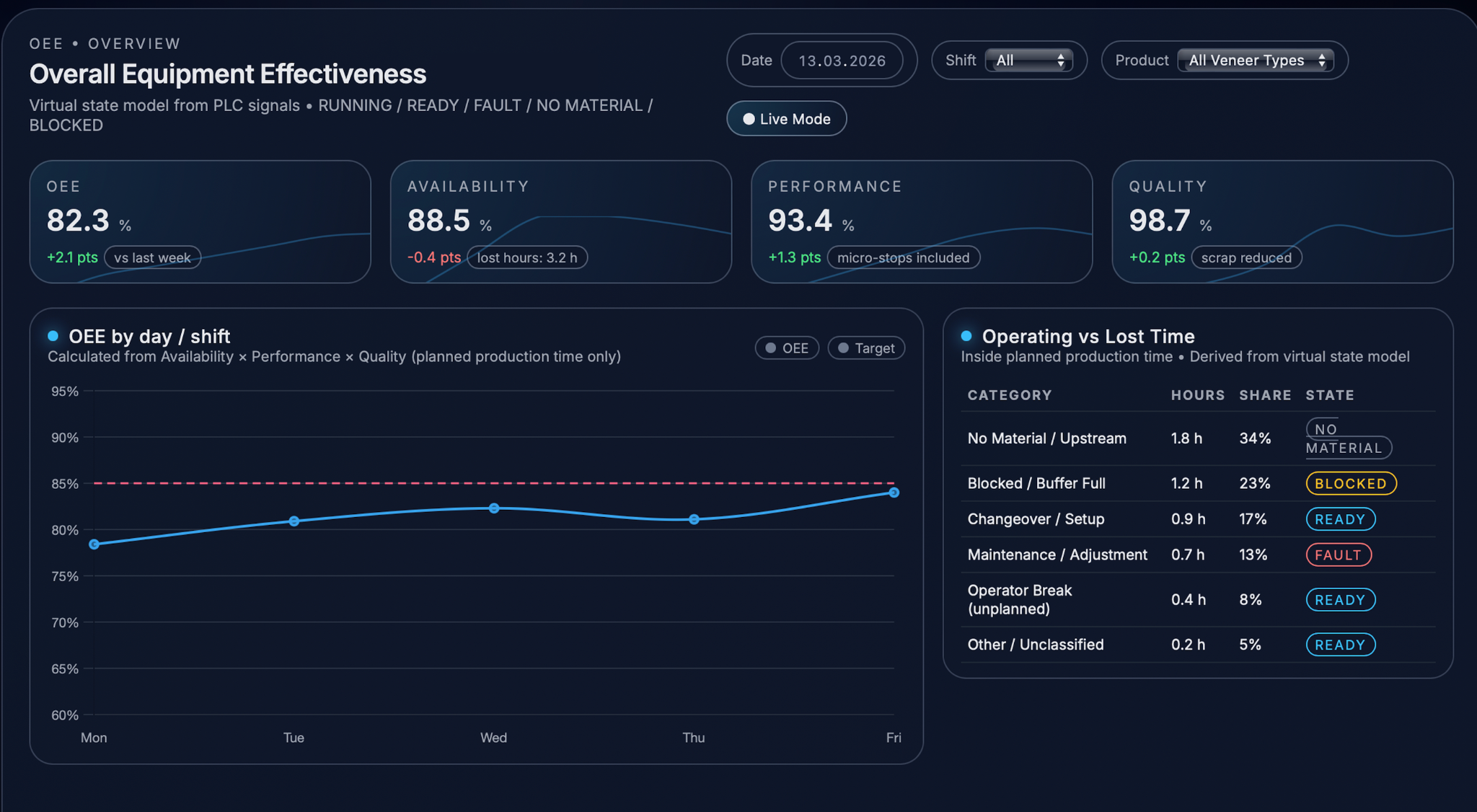 The result is a transparent and consistent view of how the production line is actually used over time, enabling reliable performance analysis and data-driven decisions.