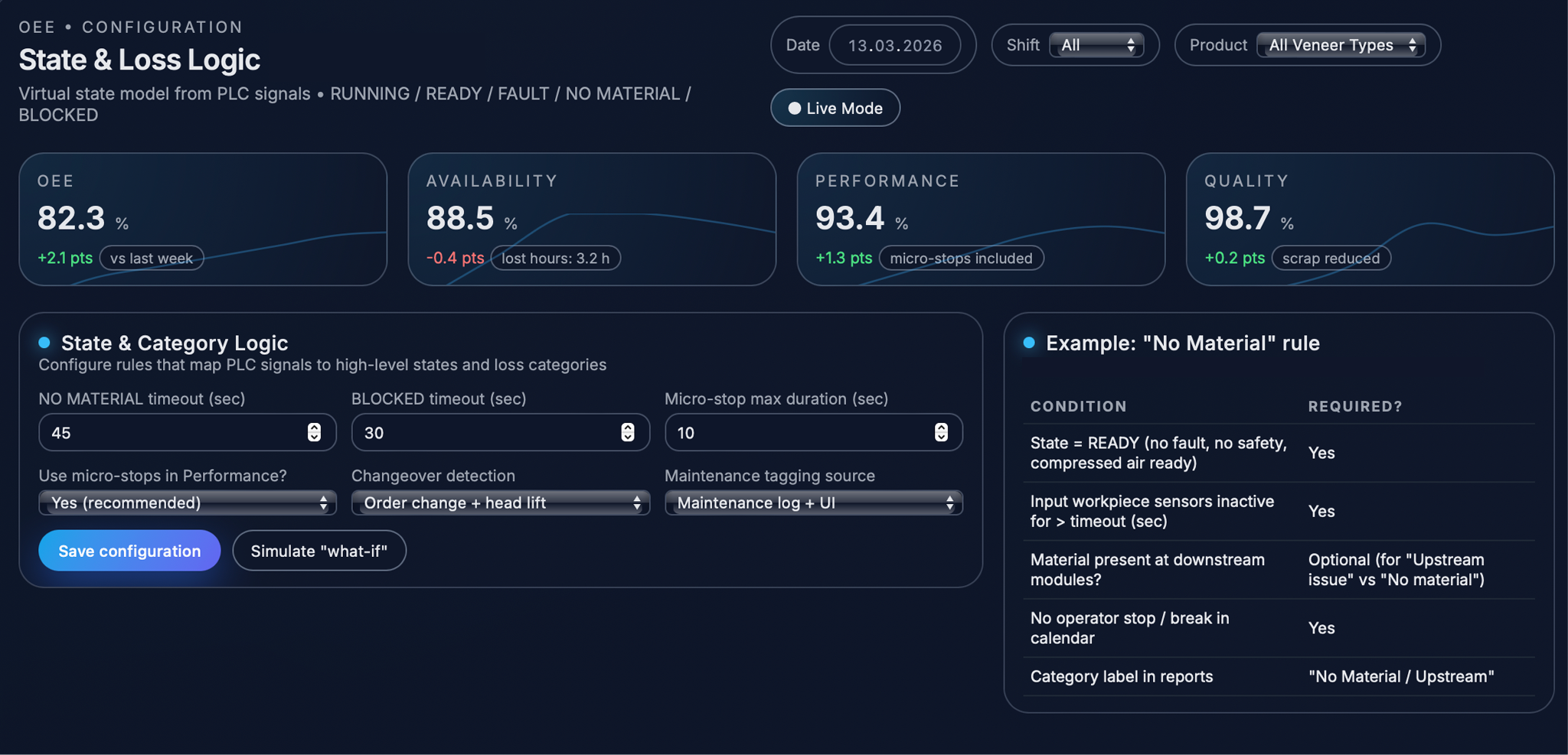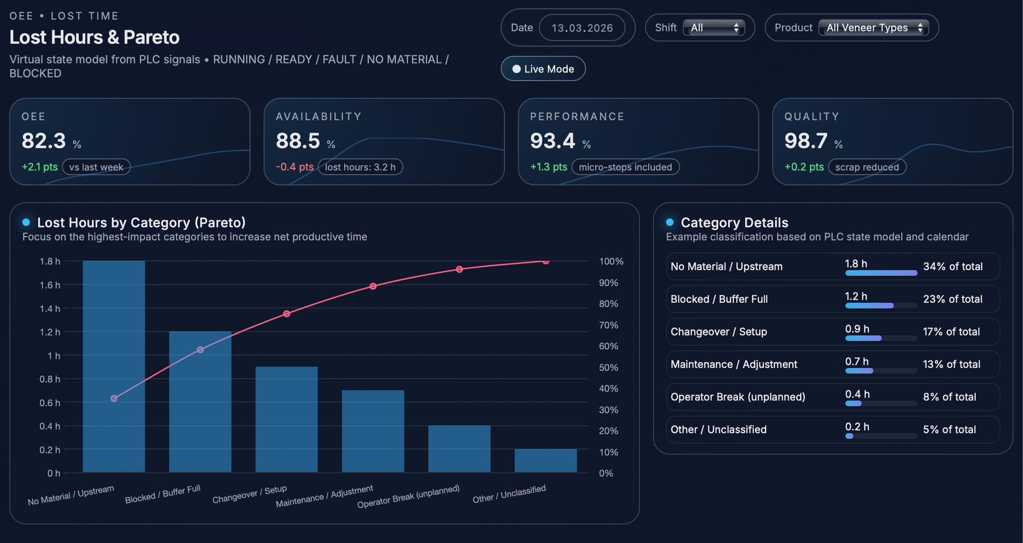 Within planned production time, any second when the line is not producing good output is treated as a potential “lost hour” and is classified according to the state model, sensor patterns, operator actions, and calendar context. The analytics engine examines all non‑RUNNING intervals and assigns them to clearly defined loss categories, turning diffuse impressions of “downtime” into measurable buckets of waste. Typical categories include No Material, where the line is READY but upstream sensors show no workpieces; Blocked, where upstream sections are waiting because downstream buffers or stacks are full or not in position; Operator Break / No Operator, where the machine is READY and material is present but no start command is given outside scheduled breaks; Changeover / Setup, where the line is intentionally stopped or running in special modes during order changes and alignment; Maintenance and Adjustment, where protective fences are open or interlocks are active in line with maintenance actions; Fault / Safety Stops, where the line is in FAULT due to technical or safety issues; and an Other category for intervals that do not yet match any rule and can be refined over time.