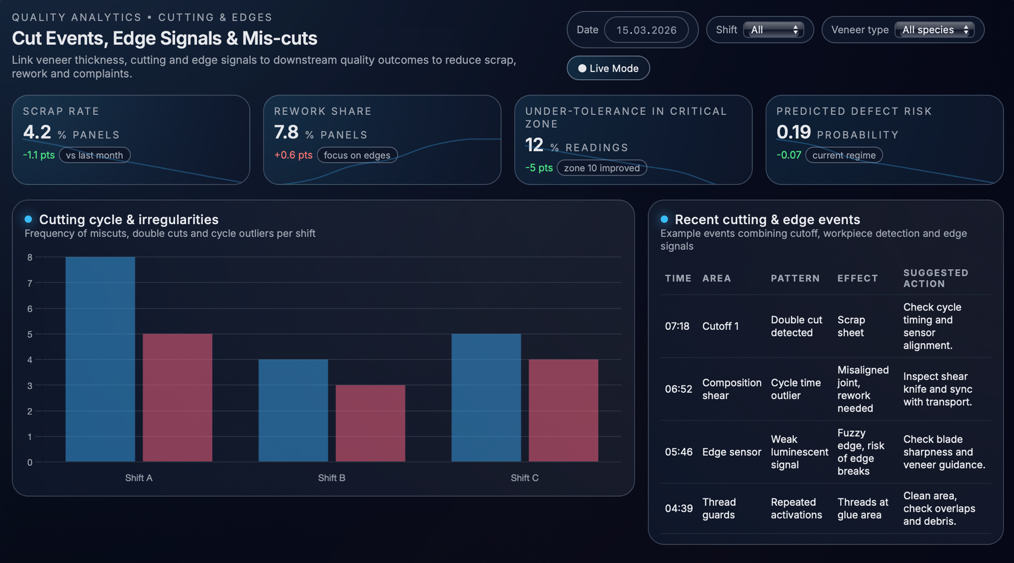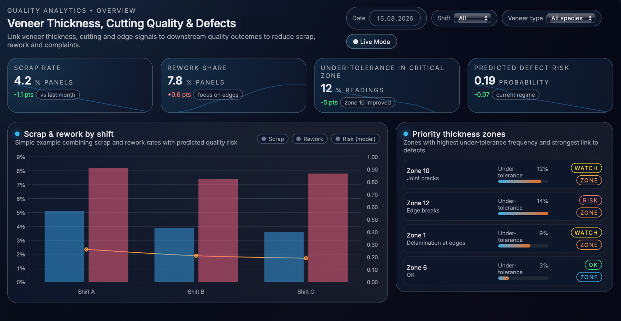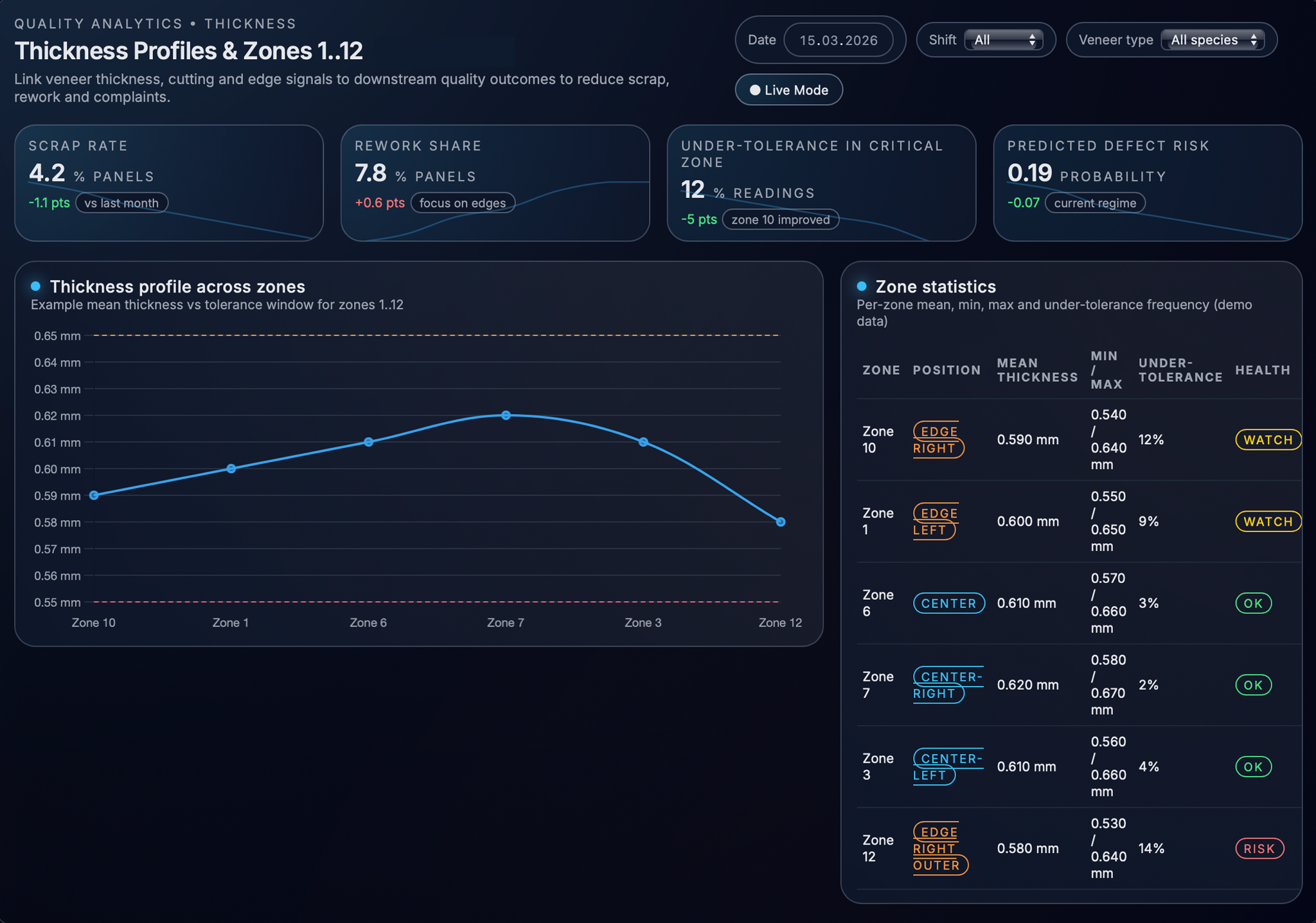 The next step is to connect thickness and cutting indicators with the final production result. For each finished piece, the system looks back at the thickness profile, cutting cycles, and edge signals that were recorded while the material was processed. These values are combined with additional information such as material type, moisture level, product type, and main process settings. Using this data, the system learns which conditions usually lead to good results and which ones often end with rework or scrap. It builds models that can estimate the risk of defects based on the current process signals. After the models are trained, they can analyse new production almost in real time. When the current signals look similar to situations that caused problems in the past, the system highlights the risk and shows which panels, zones, or process conditions may lead to defects. This allows the team to react earlier, instead of waiting until the problem appears at the end of the process.