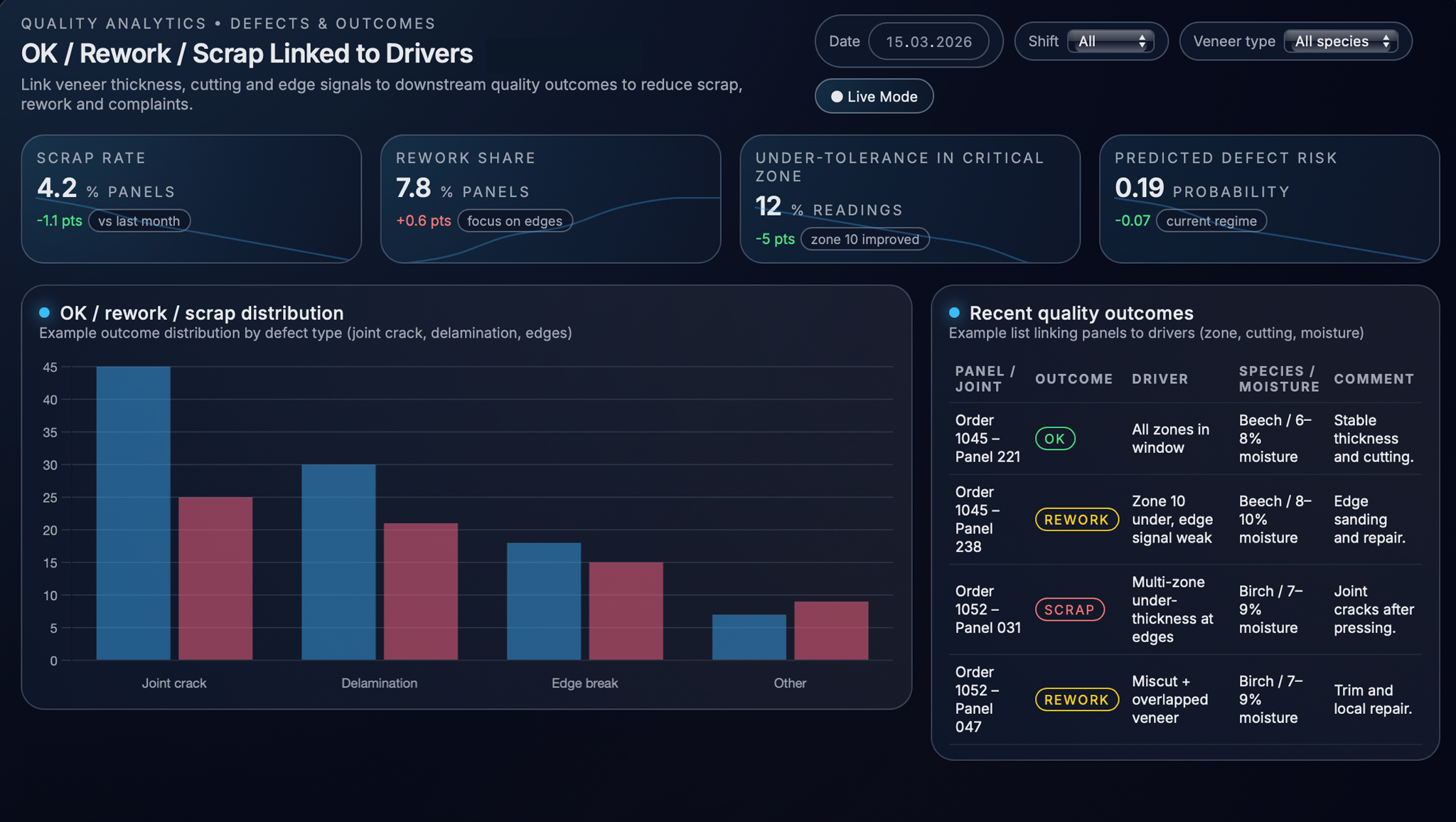 Thickness and cutting quality are critical because they directly affect how well the material holds together during pressing, handling, and final use. If the material is too thin in some areas, if thickness varies too much across the width, or if edges are damaged or not cut cleanly, the final product becomes weaker and defects are more likely to appear. This is especially important when material from different zones or batches is combined, because a weak area in one part can affect the quality of the whole panel. By linking thickness profiles and cutting events with real production results such as OK, rework, or scrap, the system makes these hidden connections visible and helps engineers understand what needs to be improved.